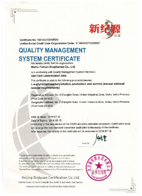 Foman Biopharma is going to apply for the following certificates to guarantee the quality of GPC (Choline Alfoscerate cas No.: 28319-77-9) etc.